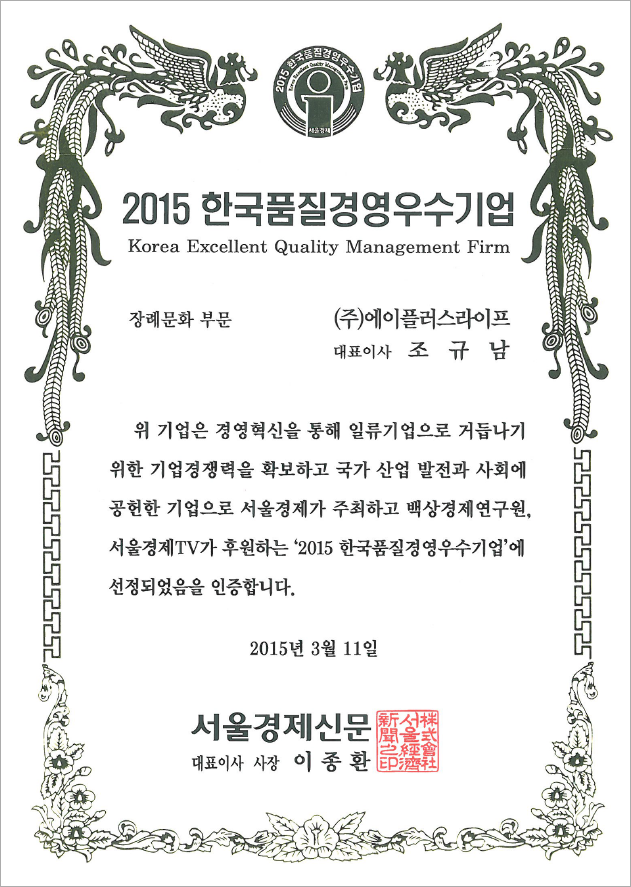 [△ 2015 한국품질경영우수기업_장례문화 부문 상장_에이플러스라이프]