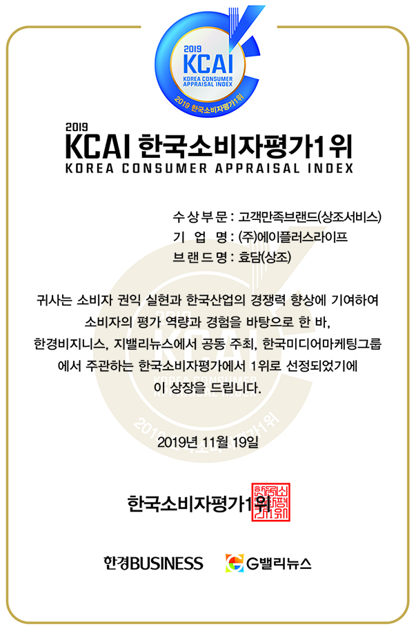 효담(상조)가 11월 19일 ‘2019 한국소비자평가 1위’ 시상식에서 고객만족브랜드(상조서비스) 부문을 수상했다.