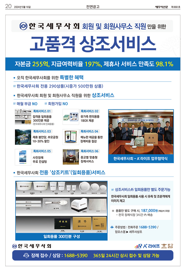 세무사 신문 5월16일자 제 868호 전면광고에 효담상조서비스 홍보광고가 실렸습니다.