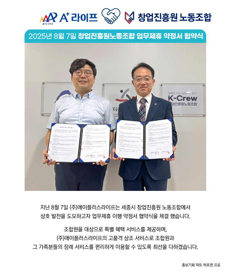 (소식) 에이플러스라이프가 창업진흥원노동조합과 제휴 협약 체결