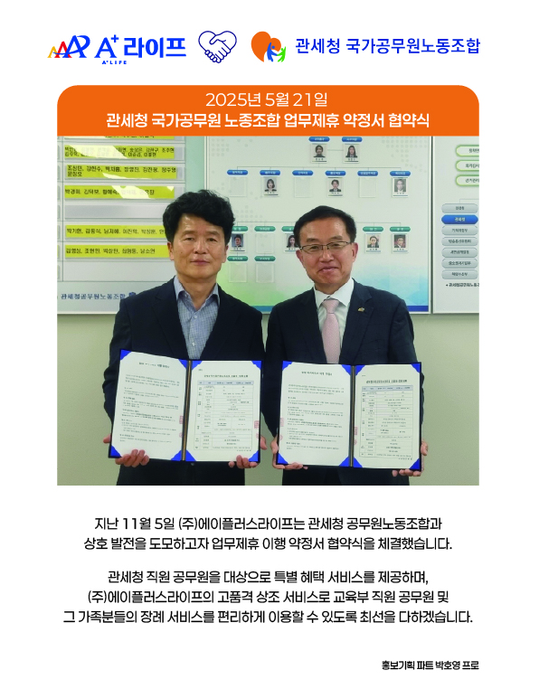 (소식) 에이플러스라이프가 관세청 국가공무원 노동조합과 업무제휴 약정서 협약식