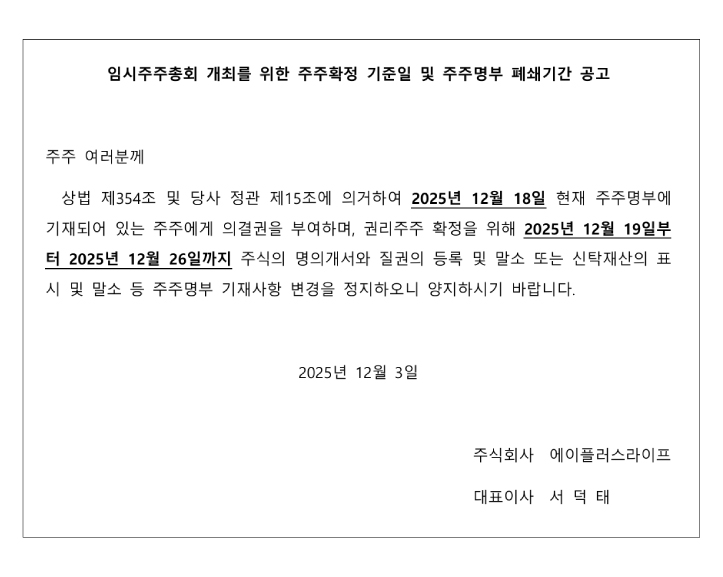 임시주주총회 개최를 위한 주주확정 기준일 및 주주명부 폐쇄기간 공고