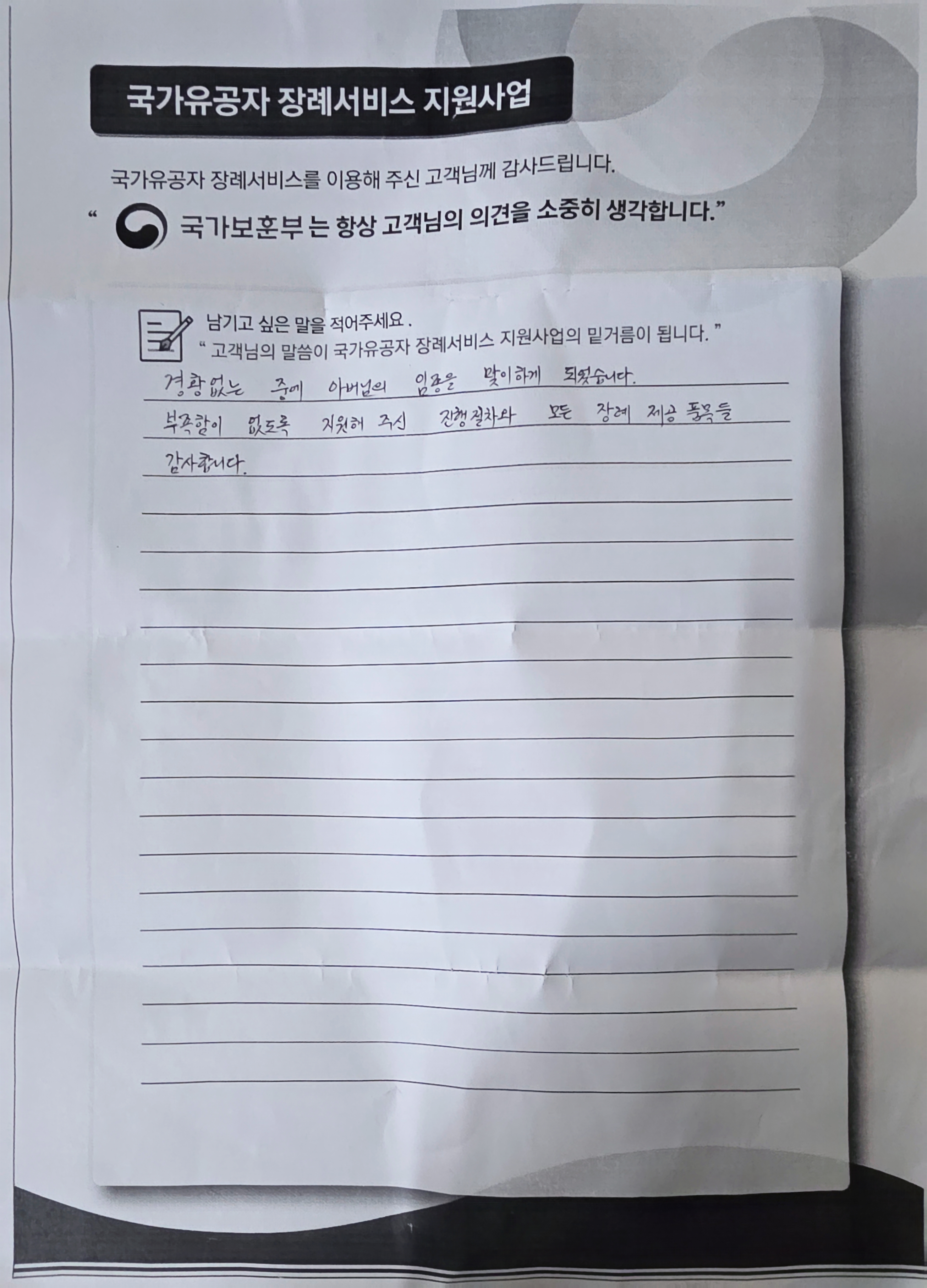경황없는 중에 아버님의 임종을 맞이하게 되었습니다. 부족함이 없도록 지원해주신 진행절차와 모든 장례제공품목들 감사합니다.