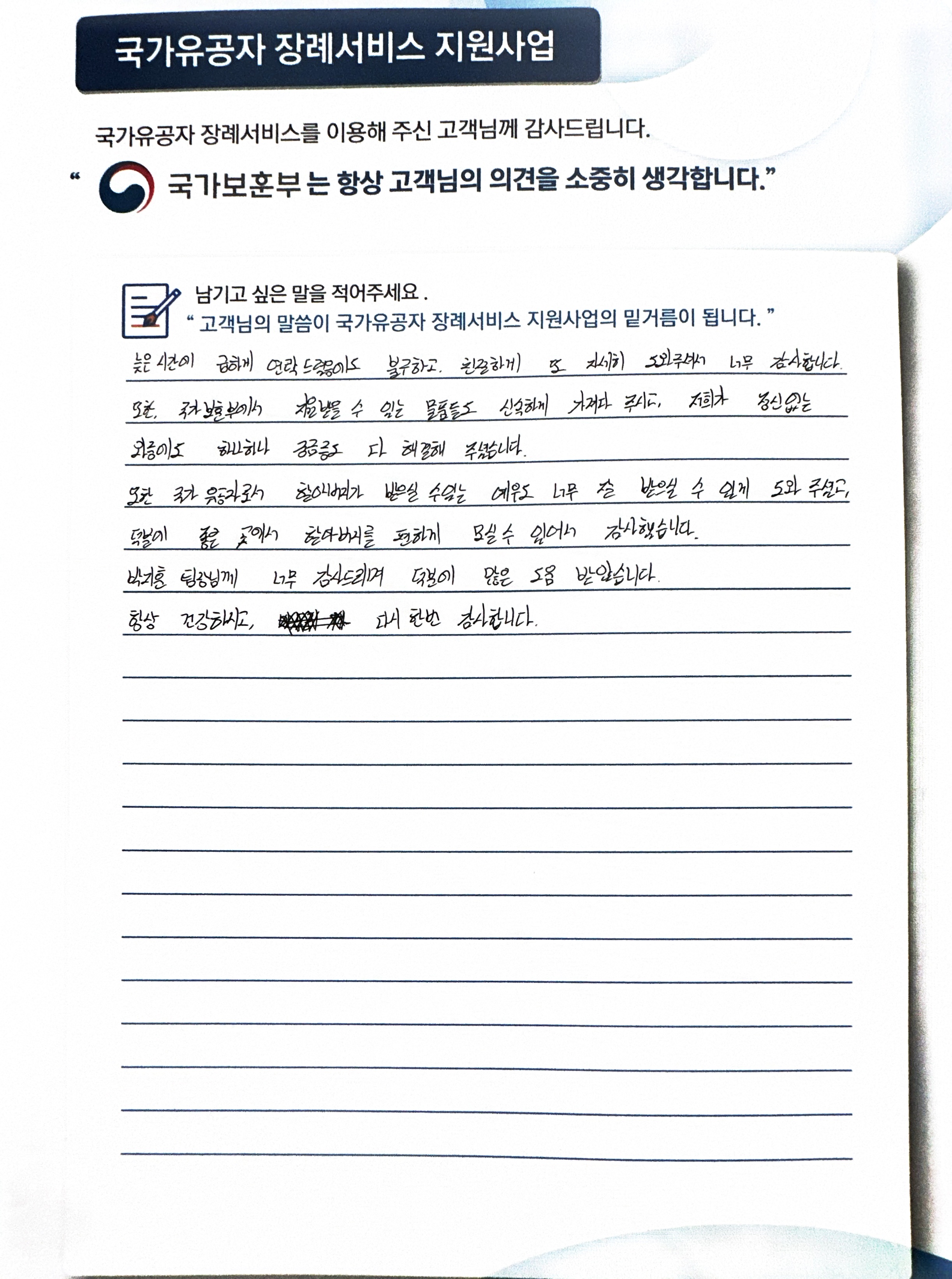 늦은 시간에 급하게 연락드렸음에도 불구하고 친절하게 또 자세히 도와주셔서 너무 감사합니다. 또한, 국가보훈부에서 지원받을 수 있는 물품들도 신속하게 가져다 주시고, 저희가 정신없는 와중에도 하나하나 궁금증도 다 해결해 주셨습니다. 또한 국가 유공자로서 할아버지가 받으실 수 있는 예우도 너무 잘 받으실 수 있게 도와주셨고, 덕분에 좋은 곳에서 할아버지를 편하게 모실 수 있어서 감사했습니다. 박지훈 팀장님께 너무 감사드리며 덕분에 많은 도움 받았습니다. 항상 건강하시고, 다시 한번 감사합니다.