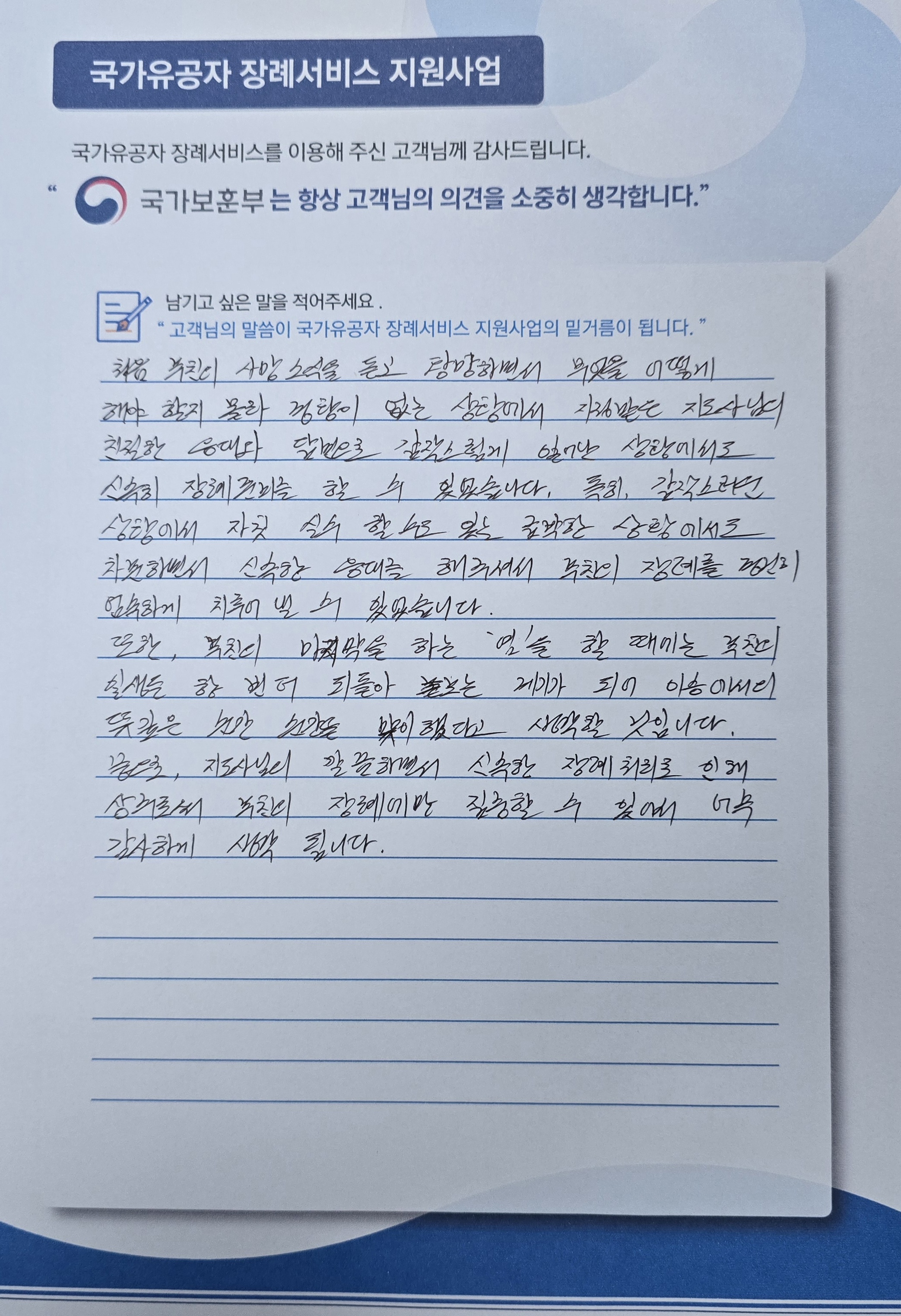 처음 부친의 사망 소식을 듣고 황망하면서 무엇을 어떻게 해야 할지 몰라 경황이 없는 상황에서 지정받은 지도사님의 친절한 응대와 답변으로 갑작스럽게 일어난 상황에서도 신속히 장례준비를 할 수 있었습니다. 특히, 갑작스러운 상황에서 자칫 실수 할 수도 있는 급박한 상황에서도 차분하면서 신속한 응대를 해주셔서 부친의 장례를 경건히 엄숙하게 치루어 낼 수 있었습니다. 또한, 부친의 마지막을 하는 '염'을 할 때에는 부친의 일생을 한 번 더 되돌아 보는 계기가 되어 이승에서의 뜻 깊은 순간 순간을 맞이했다고 생각할 것 입니다. 끝으로, 지도사님의 깔끔하면서 신속한 장례처리로 인해 상주로써 부친의 장례에만 집중할 수 있어서 너무 감사하게 생각 됩니다.