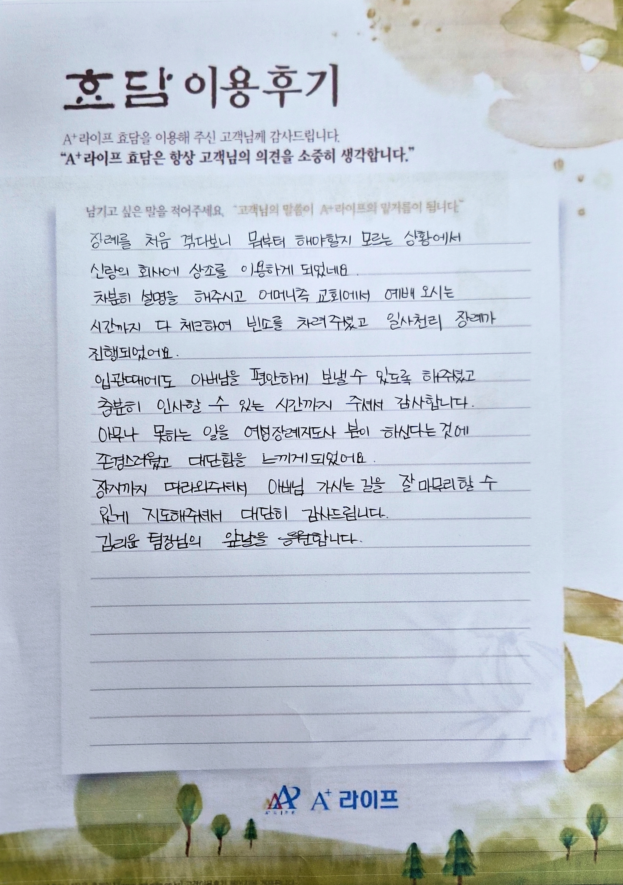 장례를 처음 겪다보니 뭐부터 해야할지 모르는 상황에서 신랑의 회사에 상조(효담상조)를 이용하게 되었네요. 차분히 설명을 해주시고 어머니측 교회에서 예배오시는 시간까지 다 체크하여 빈소를 차려주셨고 일사천리 장례가 진행되었어요. 입관때에도 아버님을 편안하게 보낼 수 있도록 해주셨고 충분히 인사할 수 있는 시간까지 주셔서 감사합니다. 아무나 못하는 일을 여성장례지도사 분이 하신다는것에 존경스러웠고 대단함을 느끼게되었어요. 장지까지 따라와주셔서 아버님 가시는 길을 잘 마무리할 수 있게 지도해주셔서 대단히 감사드립니다. 김리윤 팀장님의 앞날을 응원합니다.